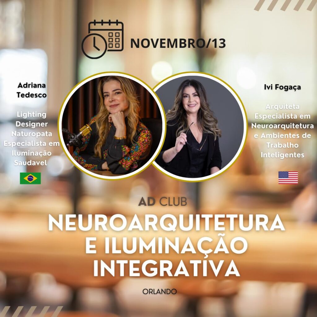 No dia 13 de novembro, Adriana Tedesco, lighting designer, naturopata e especialista em iluminação saudável, vai palestrar no AD Club, em Orlando (EUA). Ela apresentará suas pesquisas sobre Iluminação Integrativa em um workshop ao lado de Ivi Fogaça, arquiteta especialista em Neuroarquitetura e Ambientes de Trabalho Inteligentes.